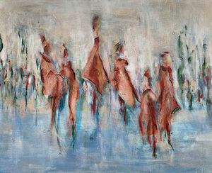 2023Acryl op linnen. Tulpen naar een foto van mijn overgrootvader, vandaar de titel nieuwe oude bloemen. Acrylique sur lin. Tulipes d'après une photo de mon arrière-grand-père, d'où le titre nouvelles fleurs anciennes.
